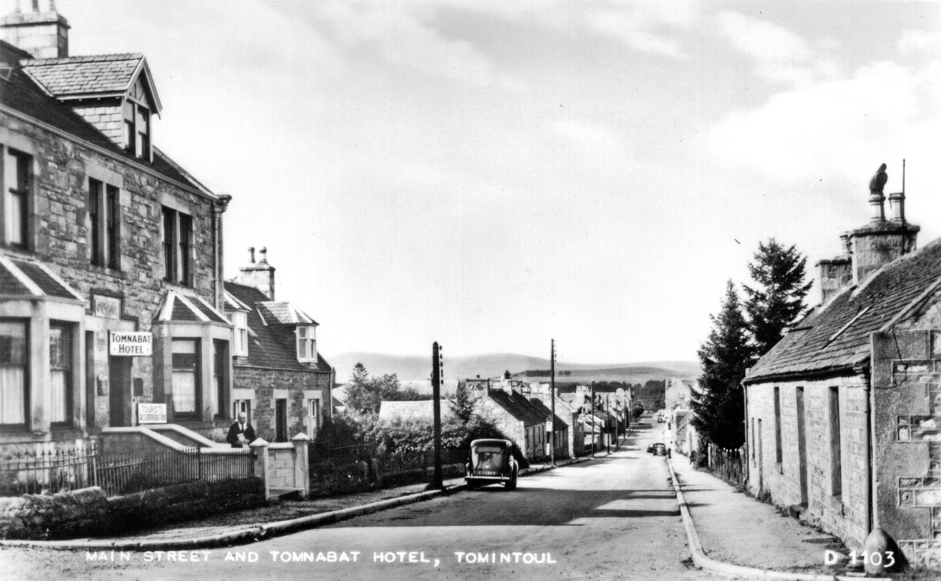Tomnabat Hotel operated from 1937 until 1959 and stood at the south end of Tomintoul's Main Street. This grey stone two-and-a-half storey house was located under the shadow of Tom na Bat hill (526m) where the Delnabo Road joins Main Street.